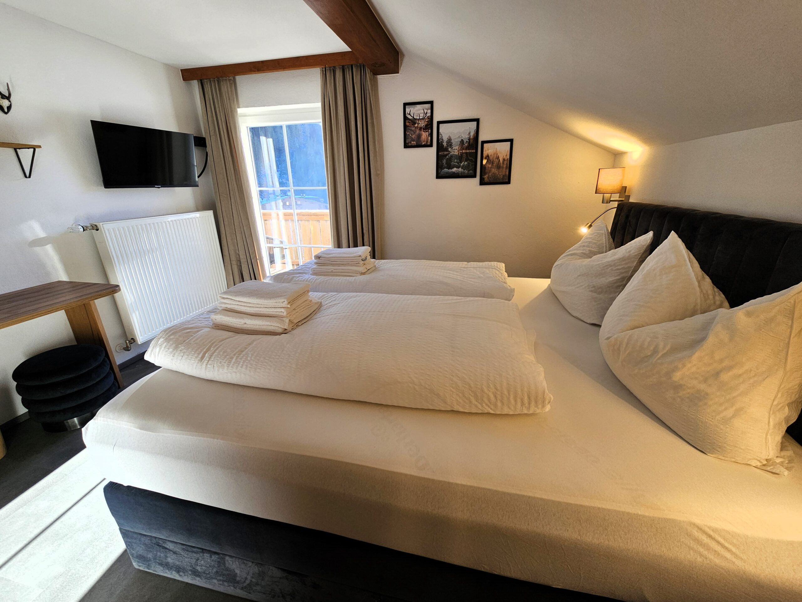 Ein kleineres, aber gut ausgestattetes Appartement mit zwei Schlafzimmern für bis zu sechs Personen, zwei Badezimmern und einem unschlagbaren Bergblick vom Balkon.